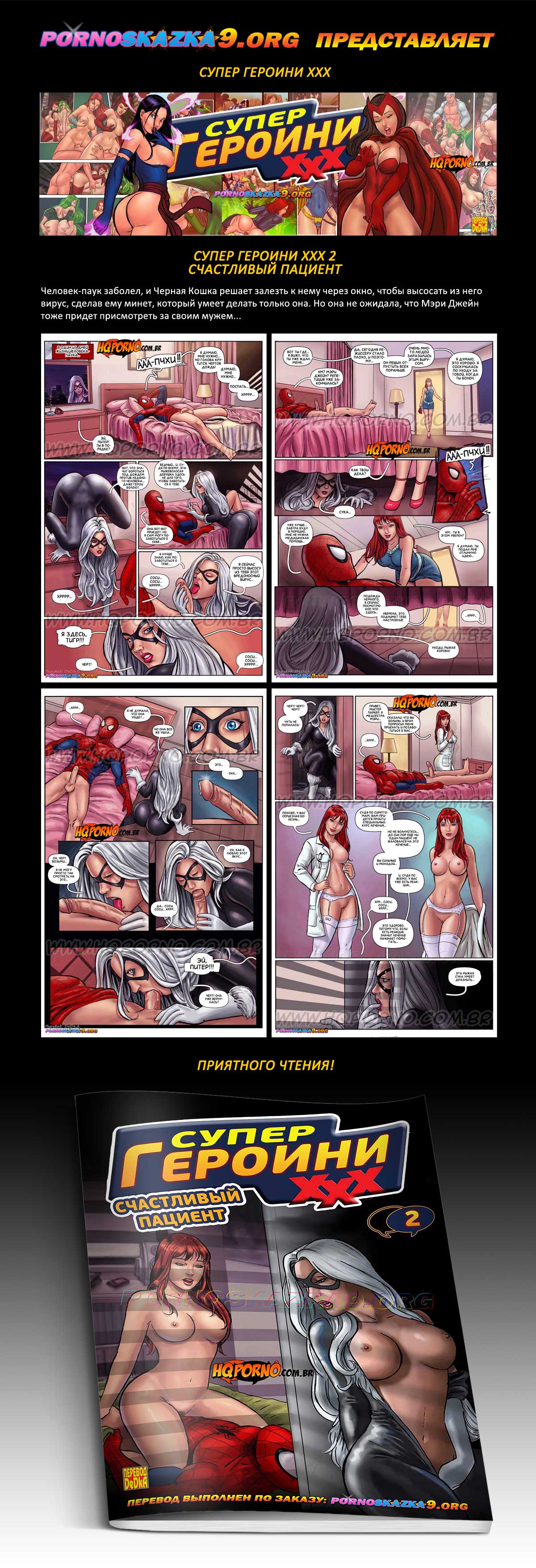 Порно комикс «Супер героини ХХХ. Часть 2. Счастливый пациент.» Человек-паук заболел, и Черная Кошка решает залезть к нему через окно, чтобы высосать из него вирус, сделав ему минет, который умеет делать только она. Но она не ожидала, что Мэри Джейн тоже придет присмотреть за своим мужем…